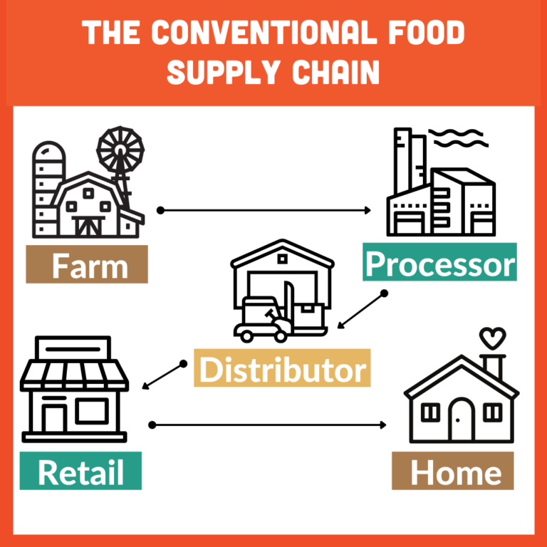 In the conventional system, food tends to make numerous stops between the farm and your plate. The journey doesn’t always take the shortest path from Point A to Point B either, moving from farms to processors to distributors to retailers all across the country (or even the world).
