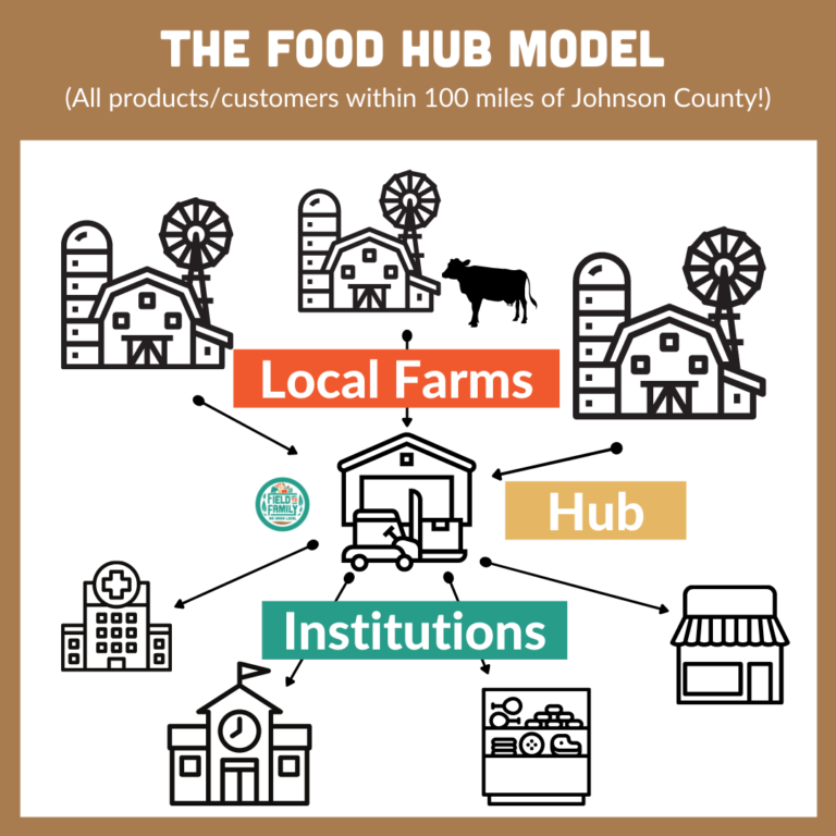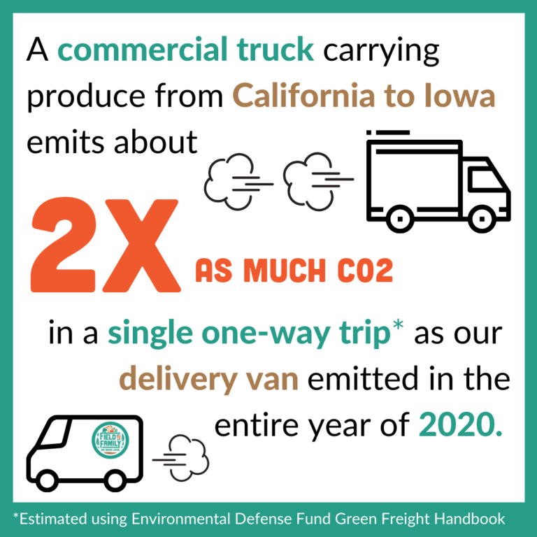 Field to Family operates a food hub out of Iowa City that serves wholesale, institutional customers, all located within 100 miles of Johnson County. Farmers bring their products to us, and we bring the products to the customers, who typically order products from several growers at once. The result is a more efficient model than farmers making deliveries straight to customers. In all, we calculated that our wholesale delivery van emitted about 2.8 metric tons of CO2 in the entirety of 2020.